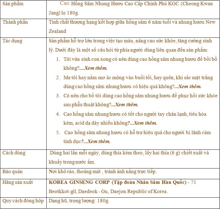 - Sản phẩm dưới dạng cao cô đặc, thành phần: tinh chất hồng sâm 6 năm tuổi và nhung hươu New Zealand.